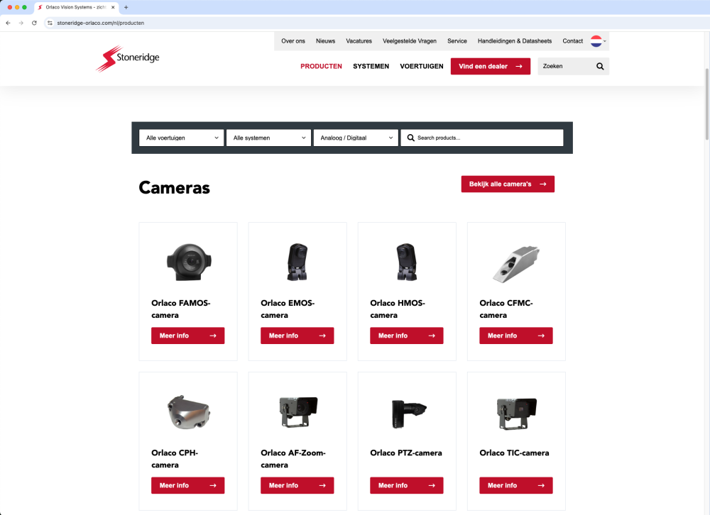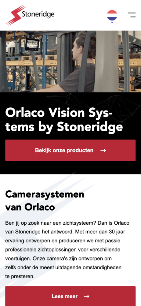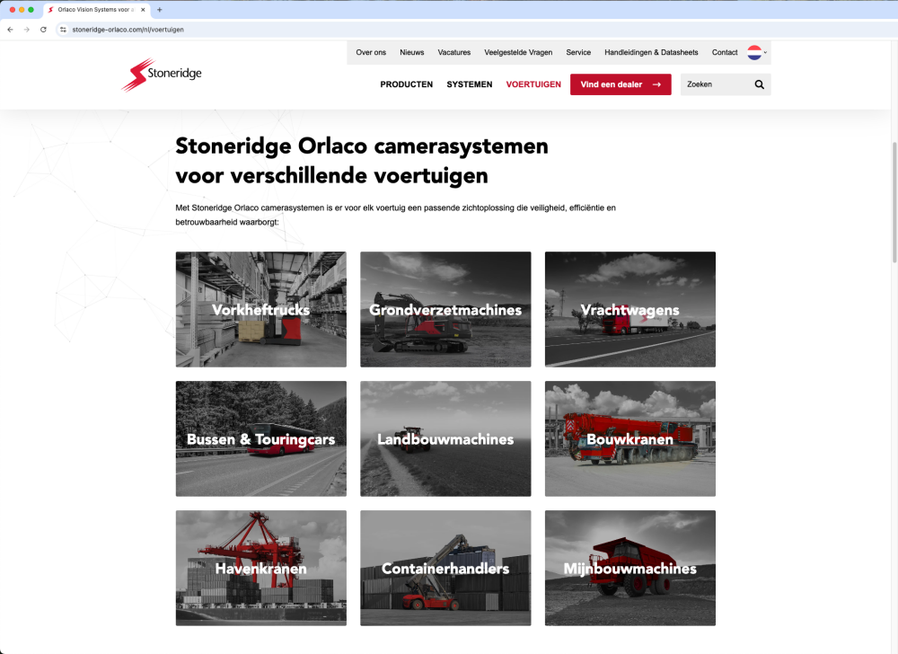 Orlaco ontwikkelt geavanceerde camera- en detectiesystemen die zichtbaarheid, veiligheid en efficiëntie verbeteren in transport, bouw en logistiek. Na een fusie met Stoneridge was één ding duidelijk: Orlaco bij Stoneridge moest online uitgroeien tot dé autoriteit om wereldwijd de doelgroep te enthousiasmeren voor de unieke voordelen van haar oplossingen en zo naamsbekendheid, marktaandeel en omzet te vergroten. Met onze bewezen expertise en 3-fasenmodel gingen we de uitdaging aan om van deze fusie een online succesverhaal te maken.